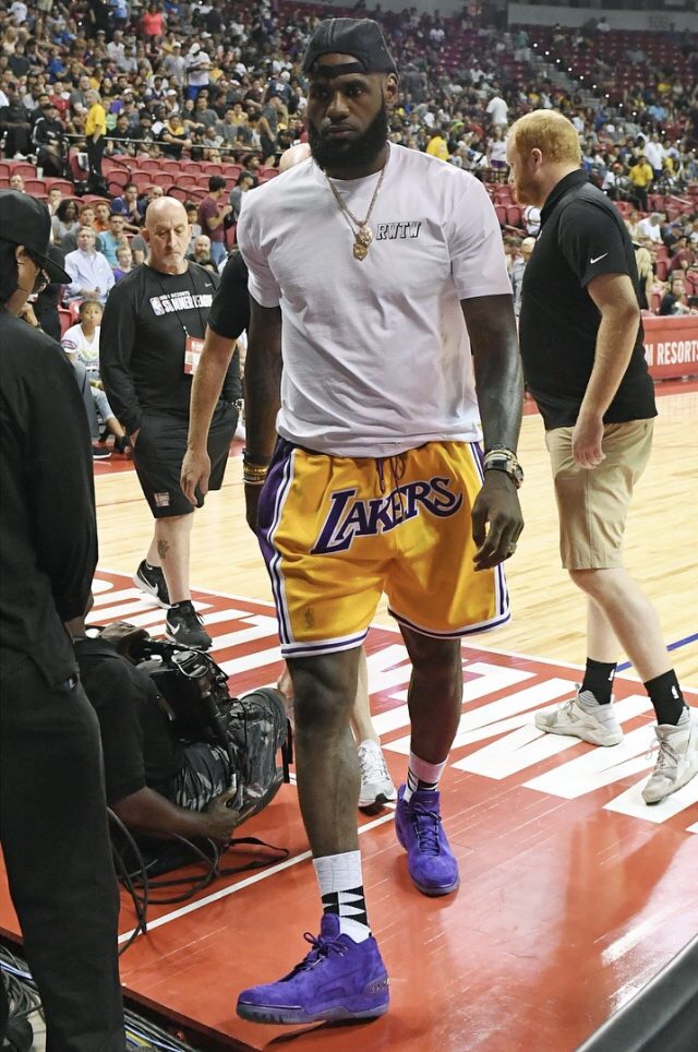 Most of us made fun of Jona Hill this summer when he was spotted rocking a blank Phoenix Suns jersey tucked into his dress pants but few people knew he was wearing a Just Don design. The best piece of the collection was spotted earlier in the summer in Las Vegas at the NBAs summer league when LeBron James sported these Muay Thai inspired Lakers shorts. (Pairing them with the all purple Zoom Generations didn’t hurt)